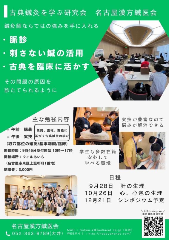 - 令和6年11月度定例会古典にしたしむ古典治療を基本に治療をしている私達ですが、最も古く基礎となる黄帝内経や難経など古典書を会の中で取り上げる機会が少なくなりました。治療の技術的な方法論だけでは古典鍼灸の真髄は理解できません。特に若い学生や初心 […]